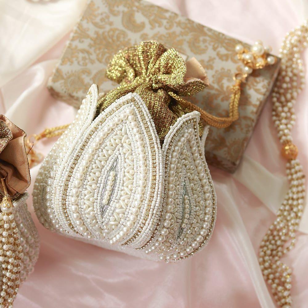 Elevate your festive and wedding ensemble with this exquisite hand-embroidered potli bag, designed in a stunning lotus-inspired silhouette. A perfect blend of traditional craftsmanship and timeless sophistication, this potli captures the essence of Indian artistry in every detail.