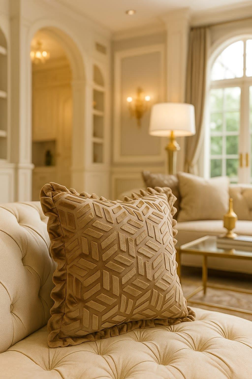 Adorn your living space with this elegant velvet throw pillow. Crafted from soft, luxurious velvet, this pillow features a unique three-dimensional geometric pattern that adds texture and depth. The delicate ruffled trim around the edges provides a classic, sophisticated touch, while the warm, neutral tone seamlessly complements any decor.