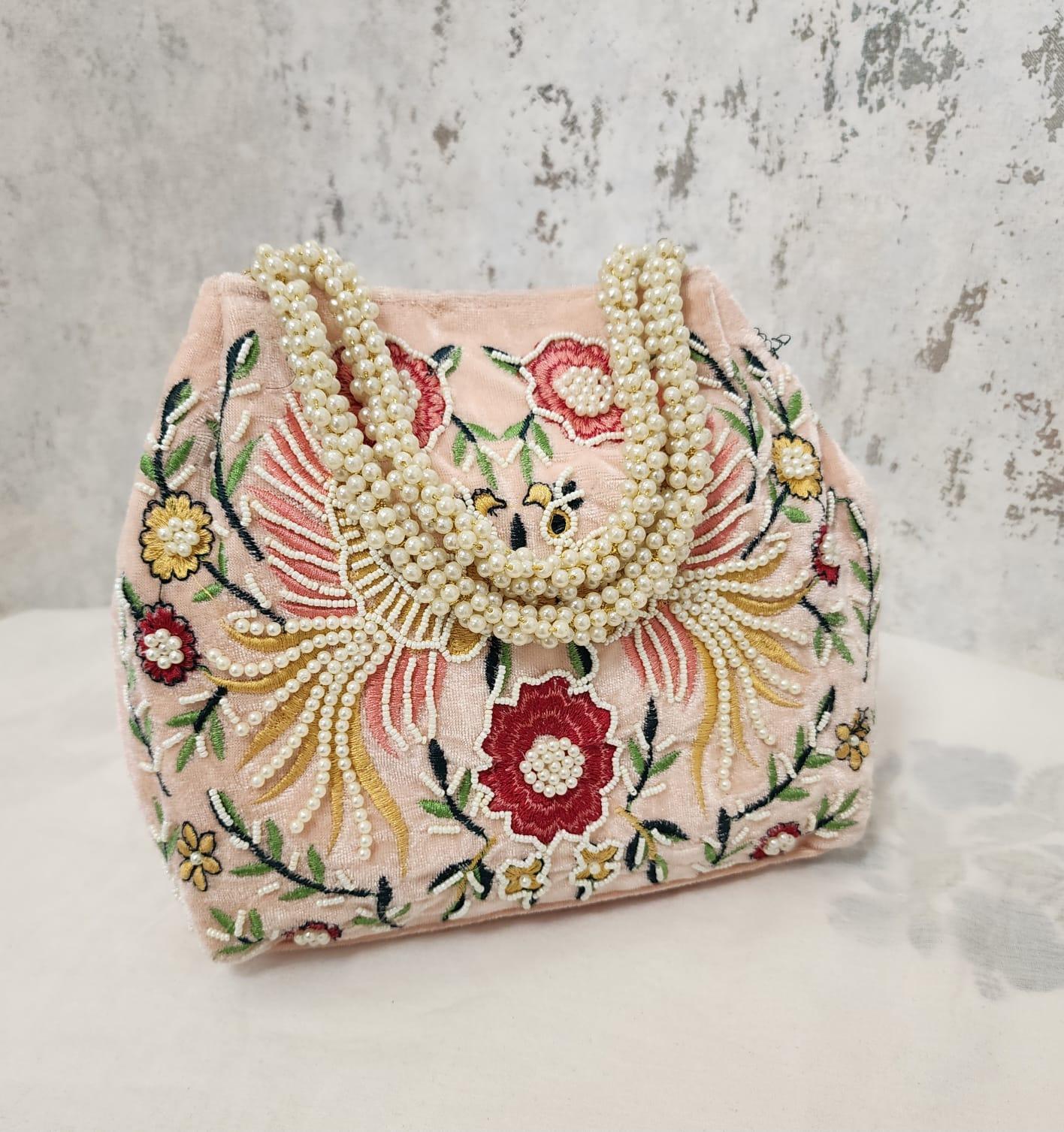 Step into a world of timeless elegance with our 'Garden of Eden' Handbag. This exquisite piece is a modern heirloom, blending a soft, blush-pink velvet with intricate hand-stitched details. A lush garden of red and pink flowers and whimsical birds is brought to life through meticulous beadwork, with gold, white, and red beads forming the beautiful floral and avian patterns.